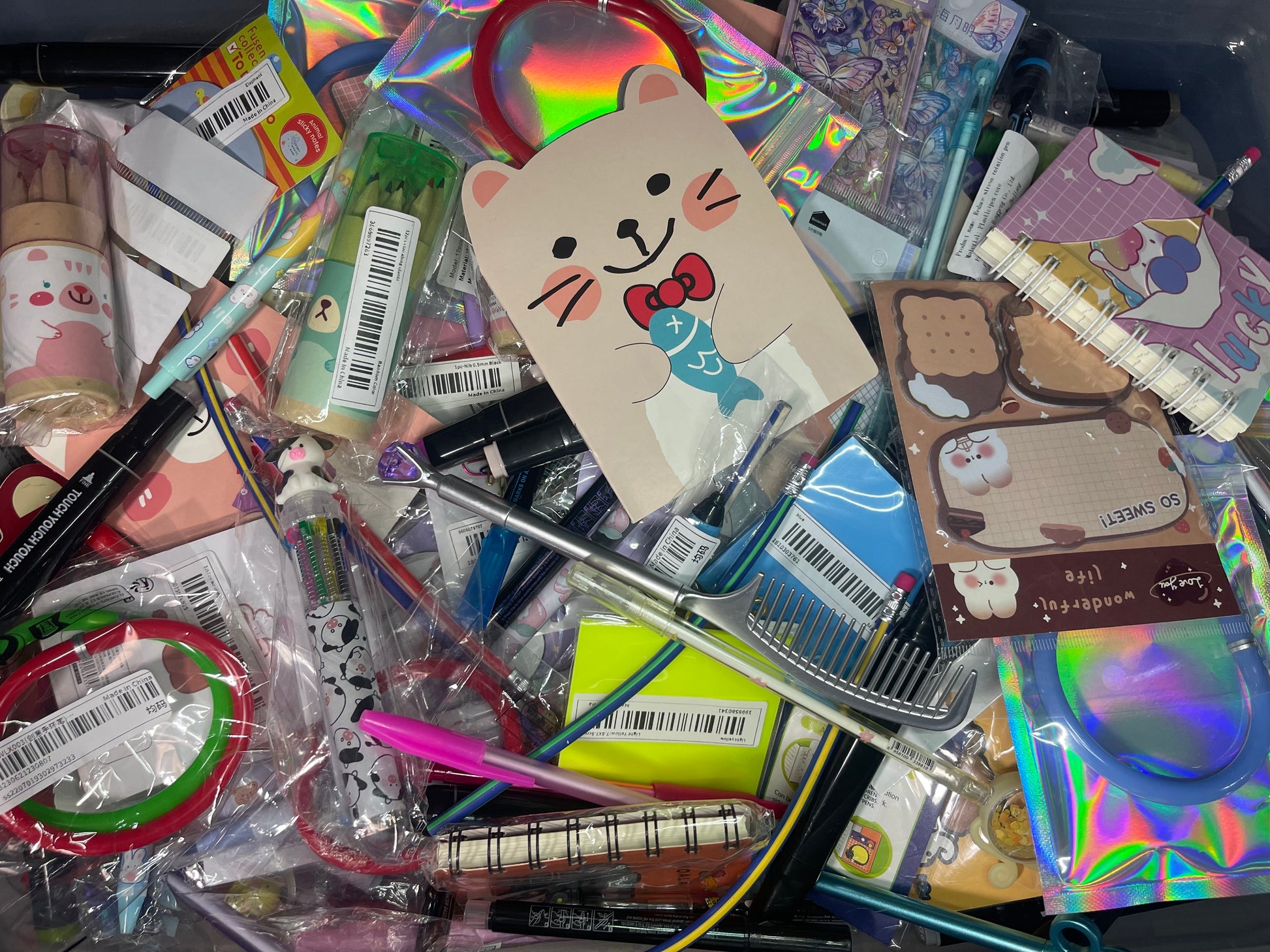 Mini notebook, pen, pencil, scissors, paper clips, washi tape, stickers, marker, colored pencil, flare pen, bookmark, tape, sticky notes.